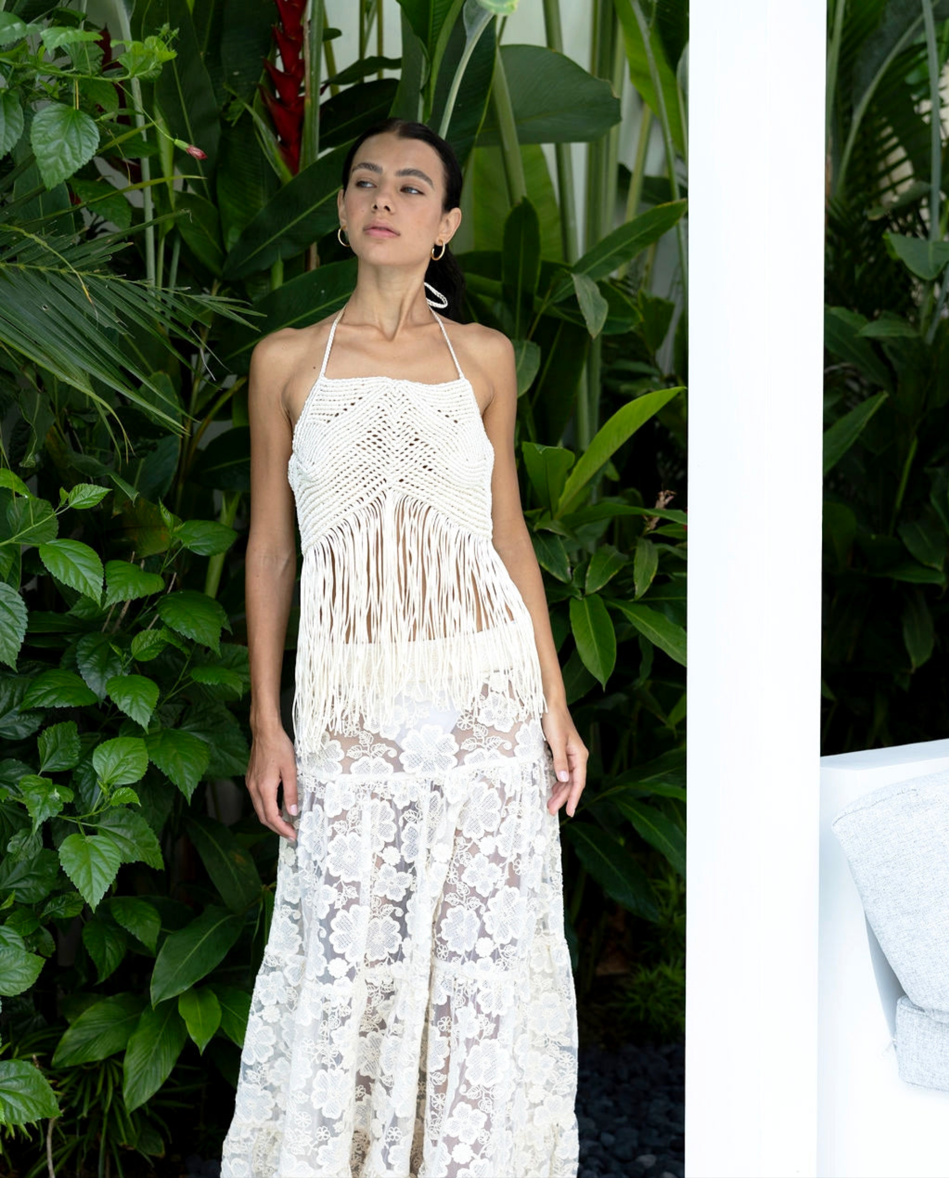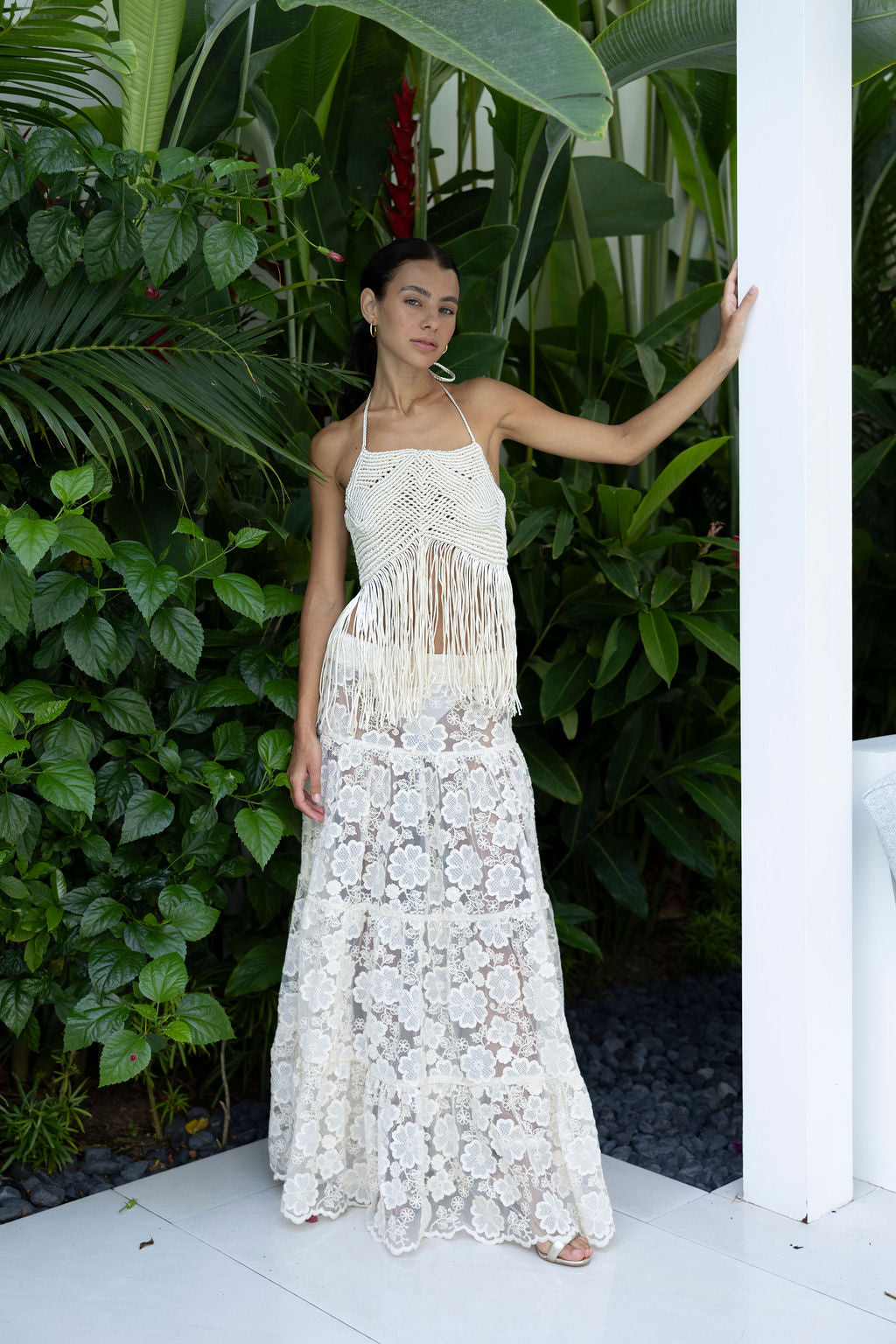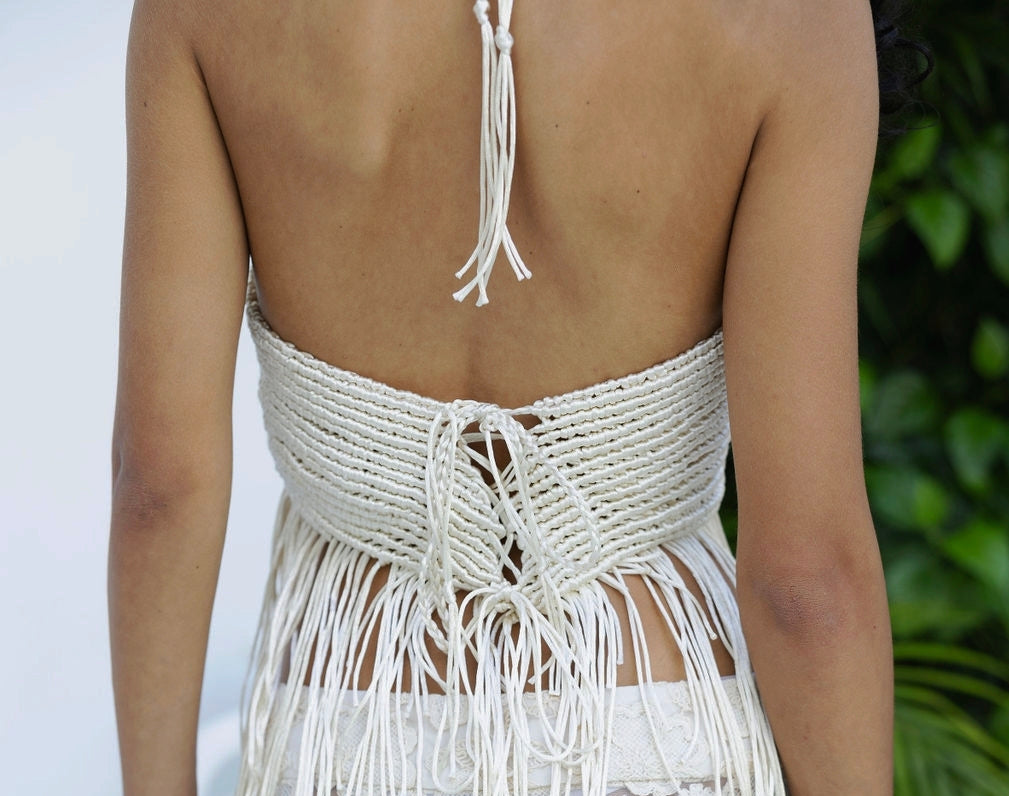The artisanal top,from coconut fiber threads,blends rustic elegance with eco -consciusness.