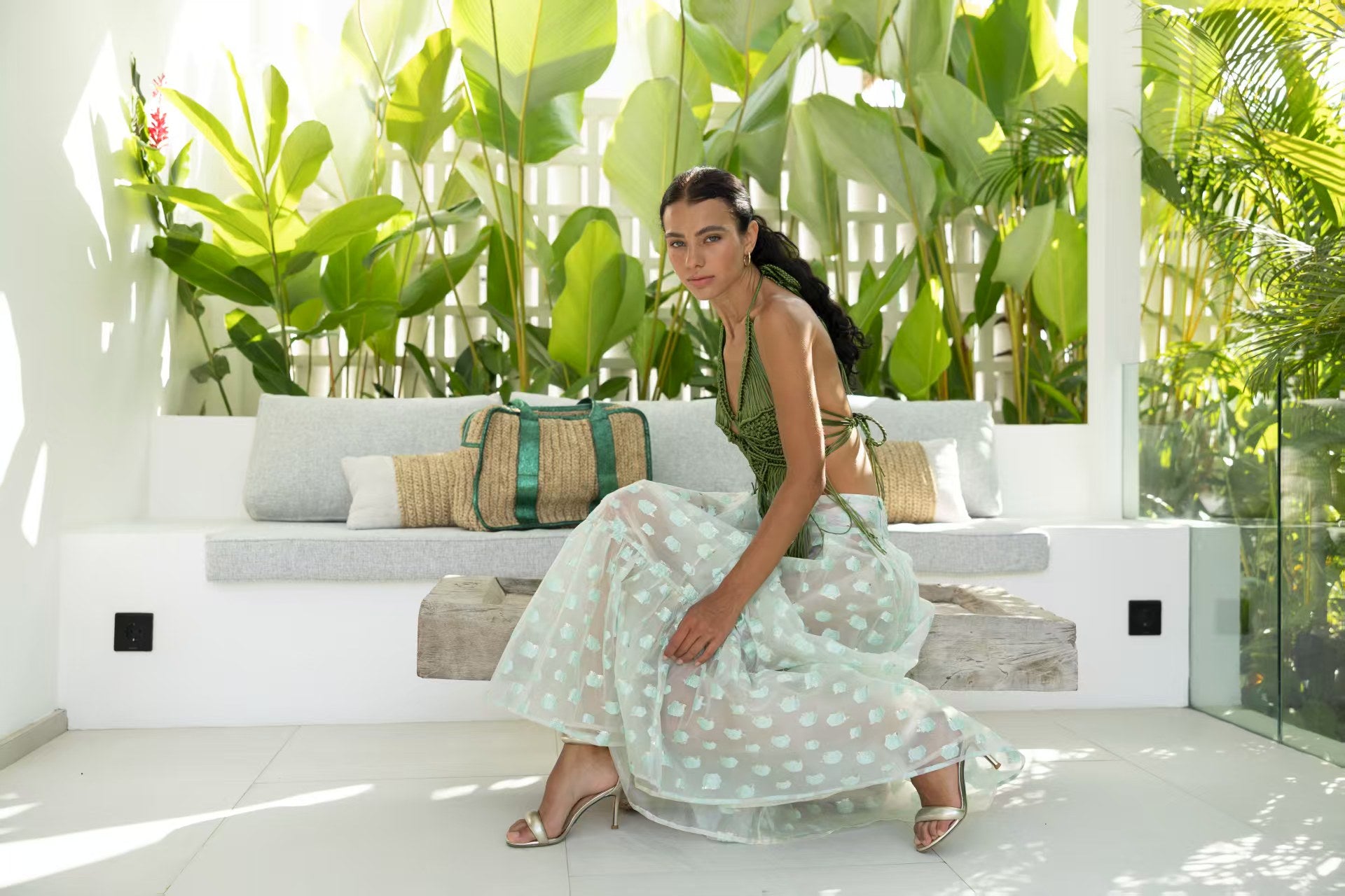 - Sparkling accents ,delicate green and gold bursts shimmer across the fabric ,catching the light with every step