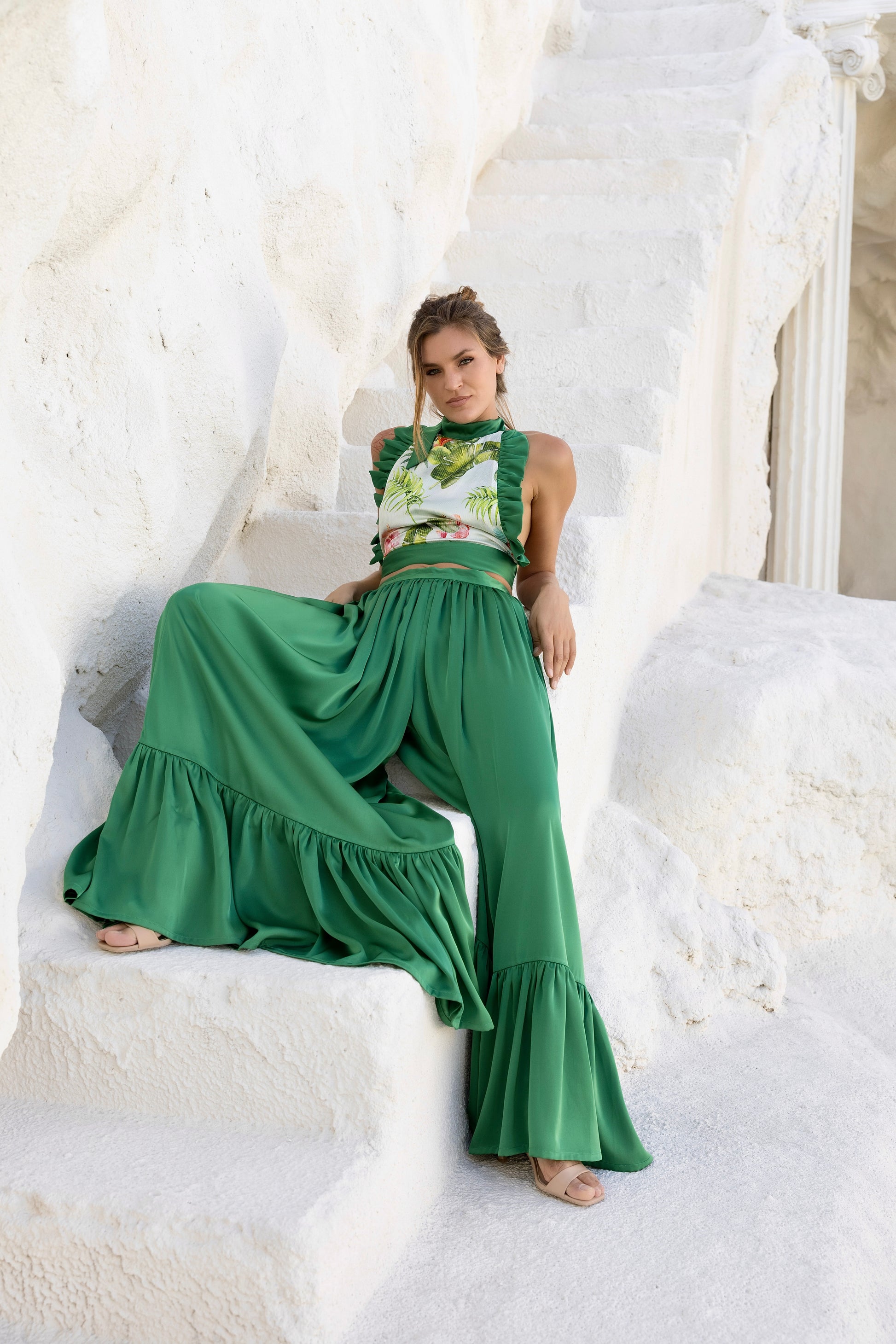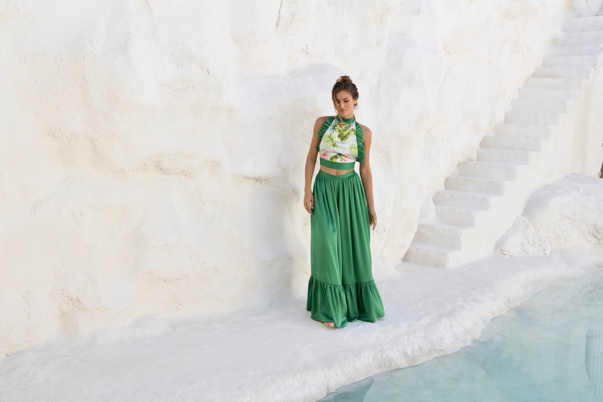 A design that plays with glamorous deception looks like a skirt but secretly pants!