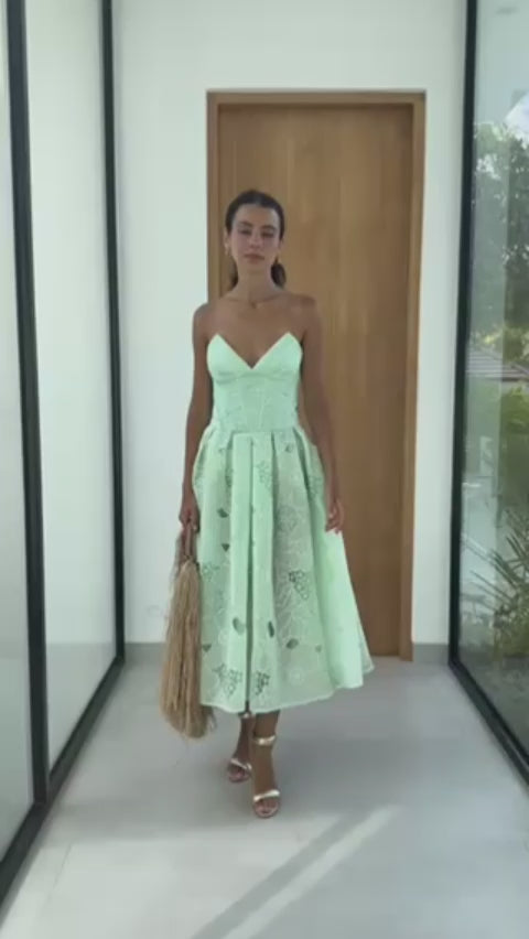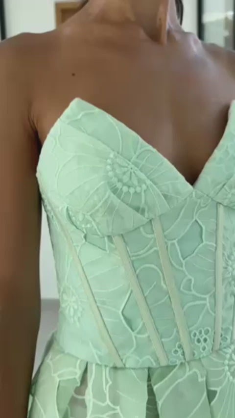Light green dress with corset and openwork floral embroidery romantic elegance and thoughtful craftsmanship